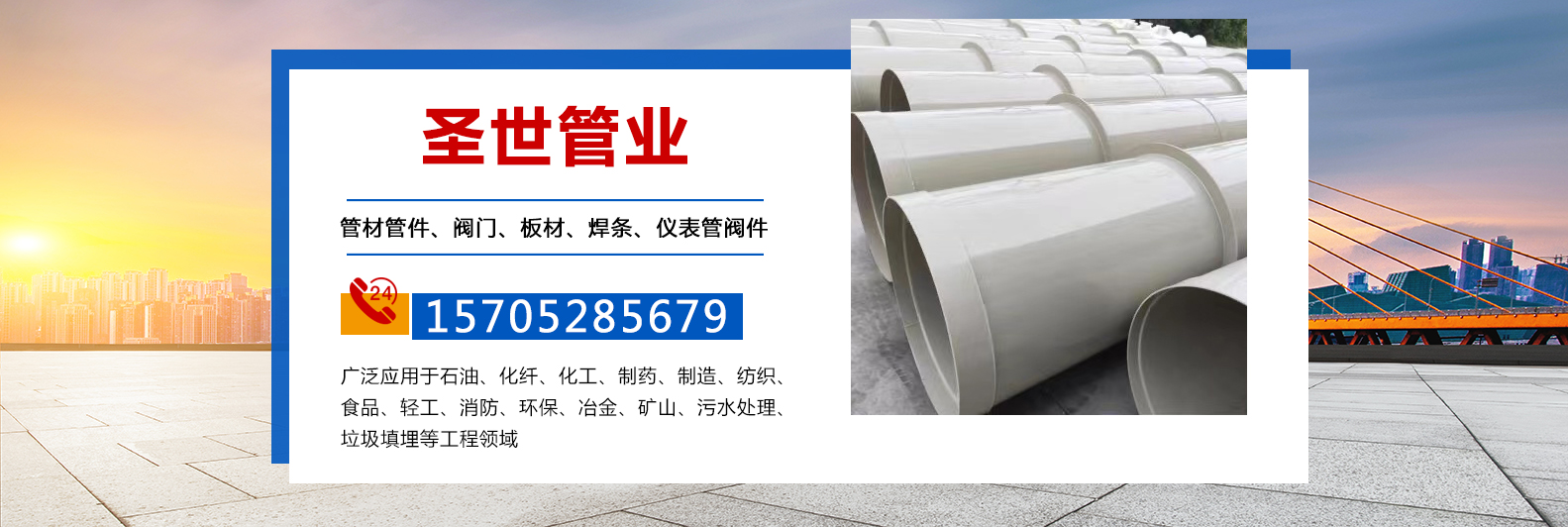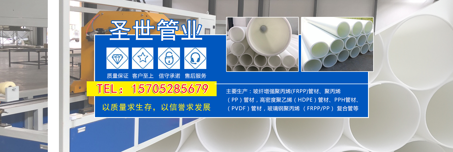 公司在发展过程中不断吸收消化国际新进技术,主要生产:玻纤增强聚丙烯(FRPP)管材、聚丙烯(PP)管材,高密度聚乙烯(HDPE)管材、PPH管材、(PVDF)管材,玻璃钢聚丙烯 (FRPP/PP) 复合管、聚乙烯双壁波纹管(HDPE)以及配套的弯头、三通、异型管、法兰、阀门、板材、焊条、仪表管阀件等系列产品。公司拥有多台流水线设备,成立工程塑料管道安装部,企业包售后服务质量。产品具有耐腐蚀、质量轻、强度高、抗渗漏、抗老化、抗拉伸、抗弯、耐磨、流阻小、造价低、寿命长、安装维修方便等优点。